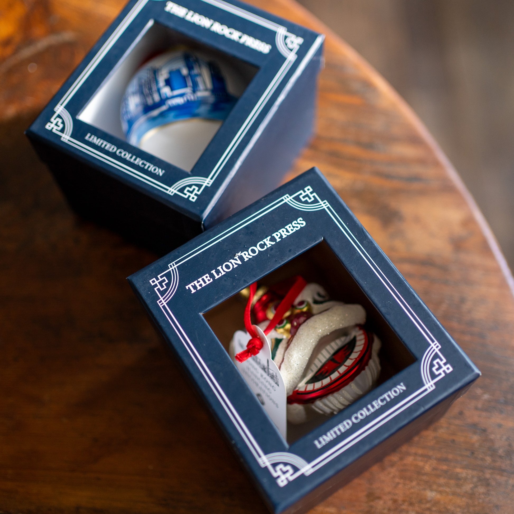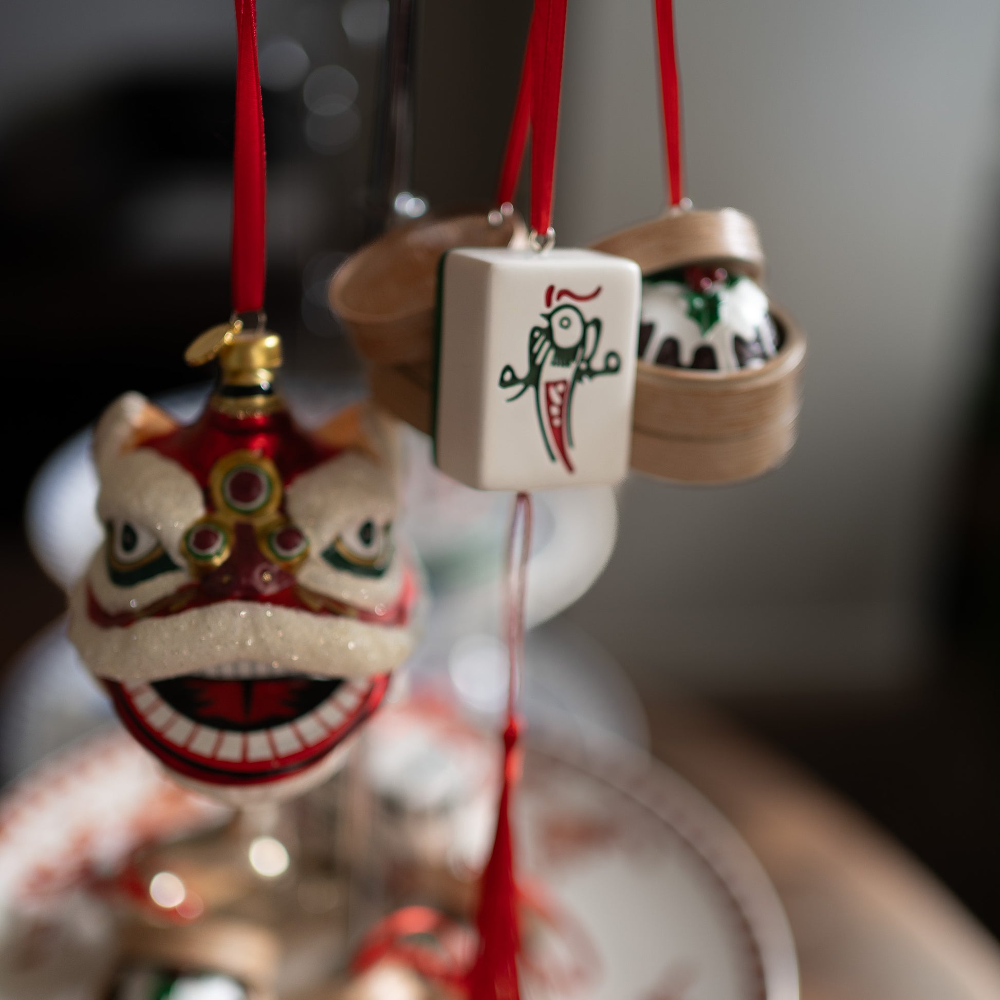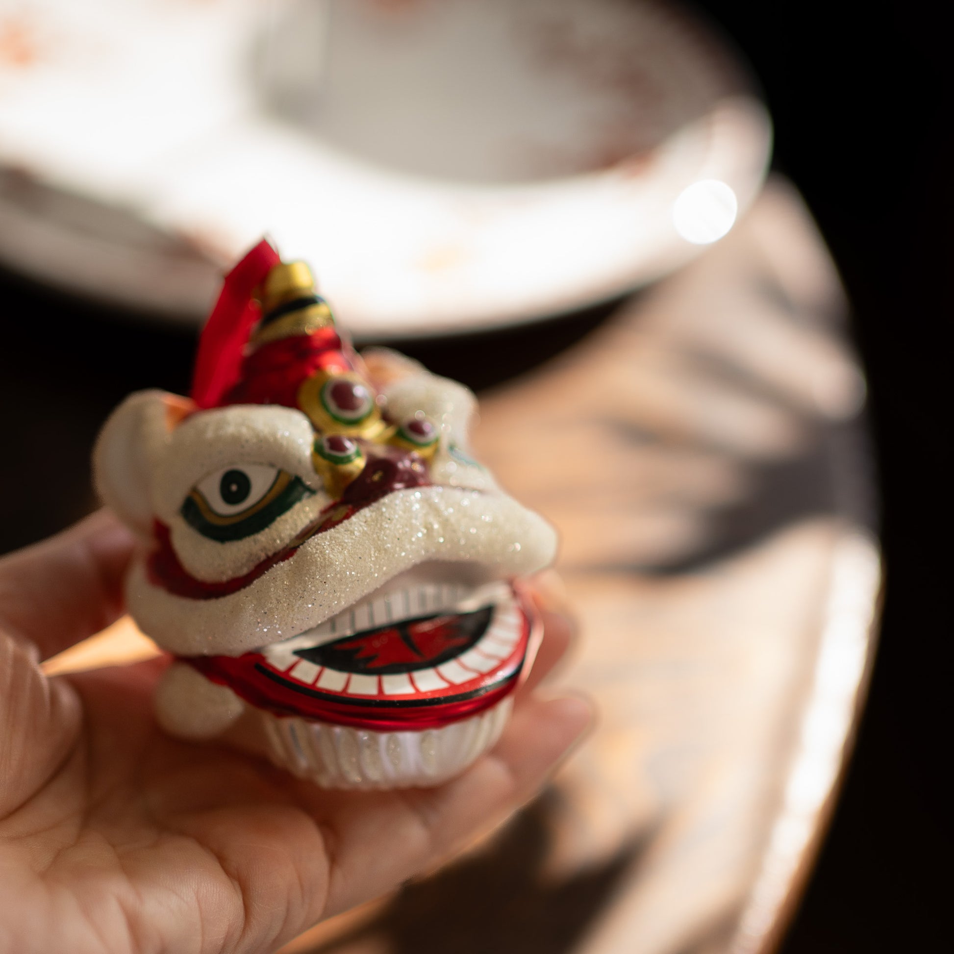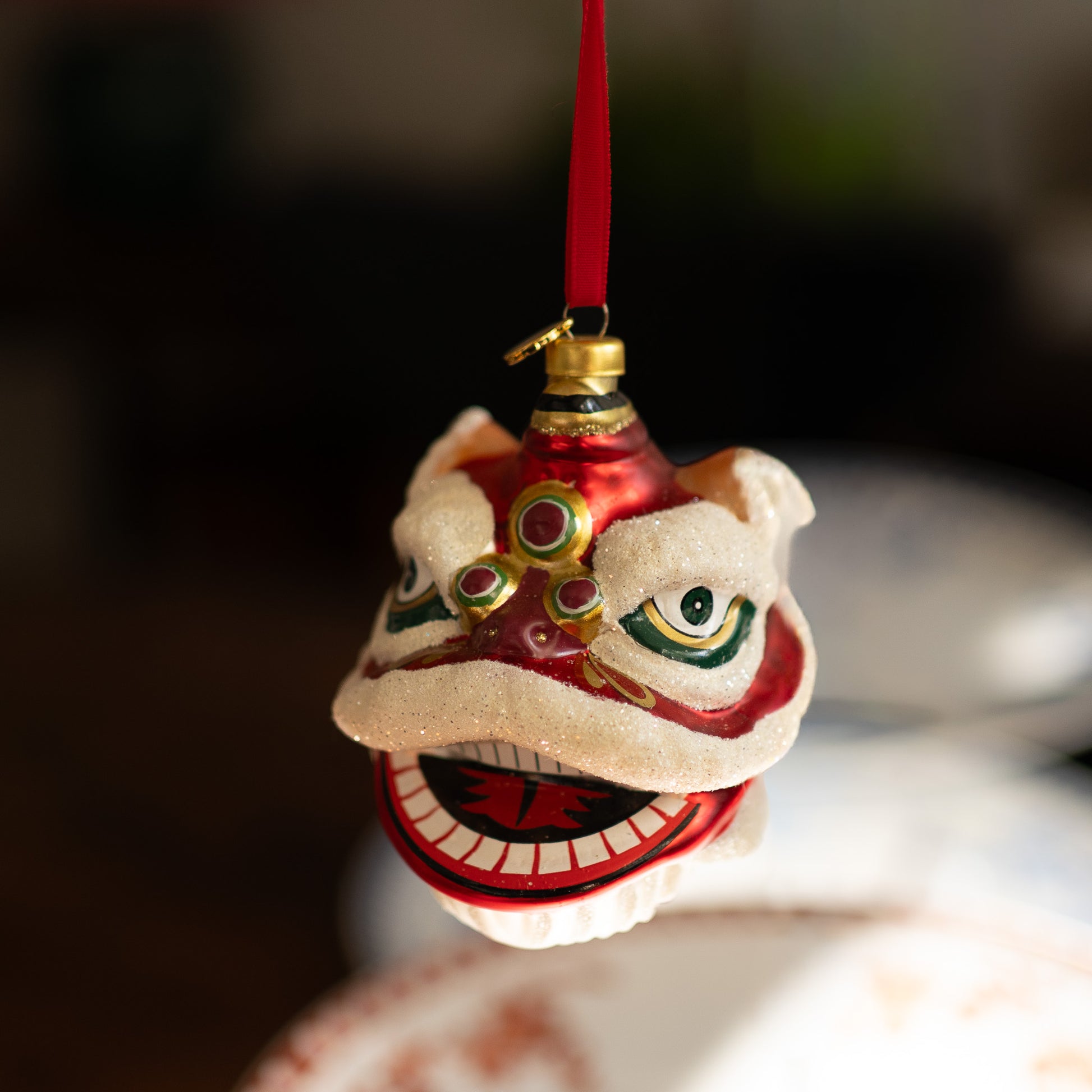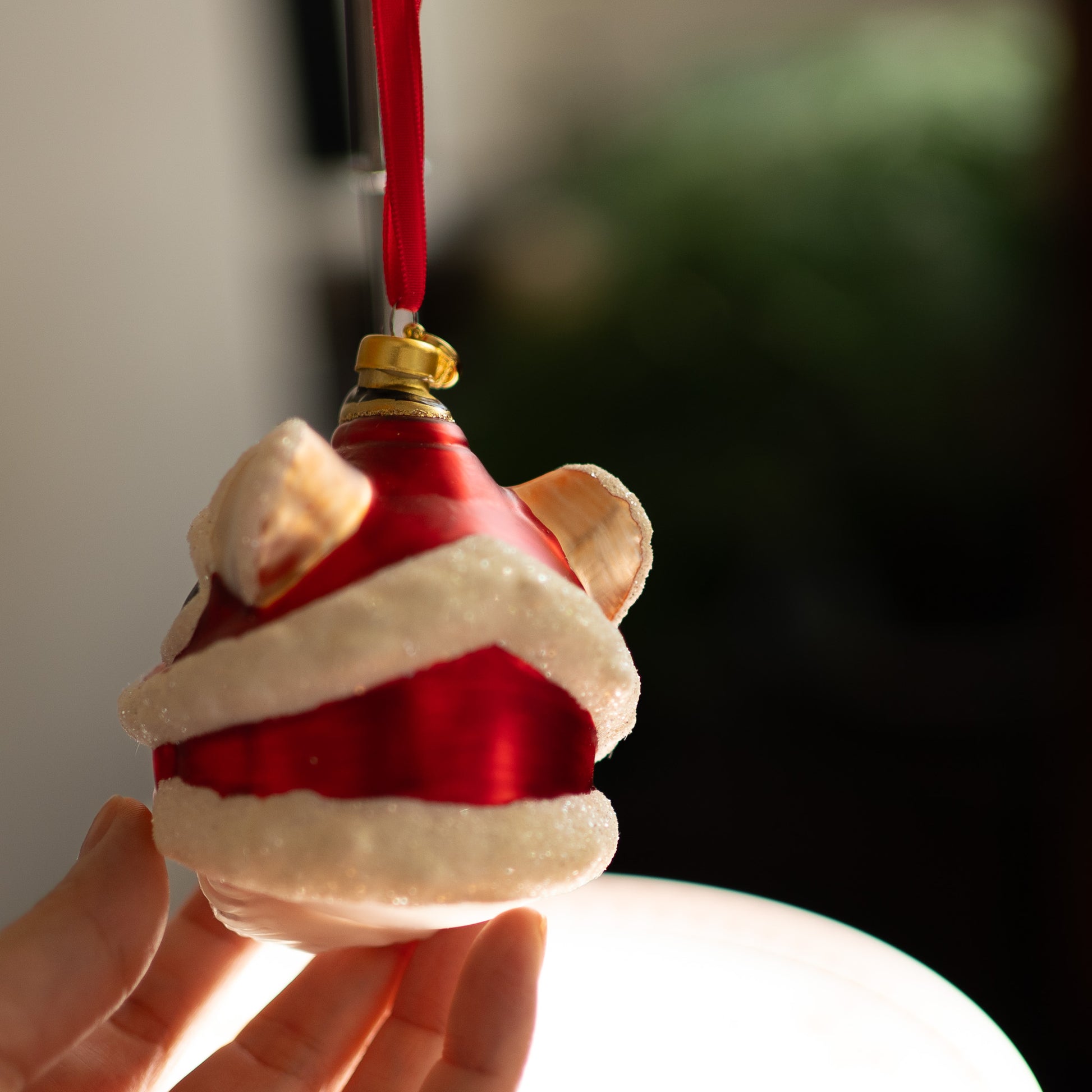 サンタクロースの衣装をまとった中国のライオンがモチーフのオーナメント。