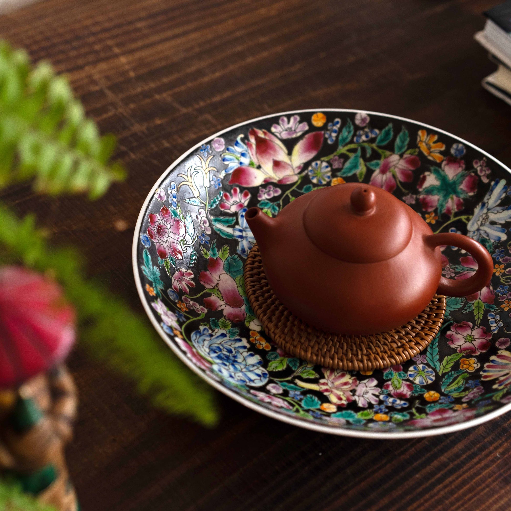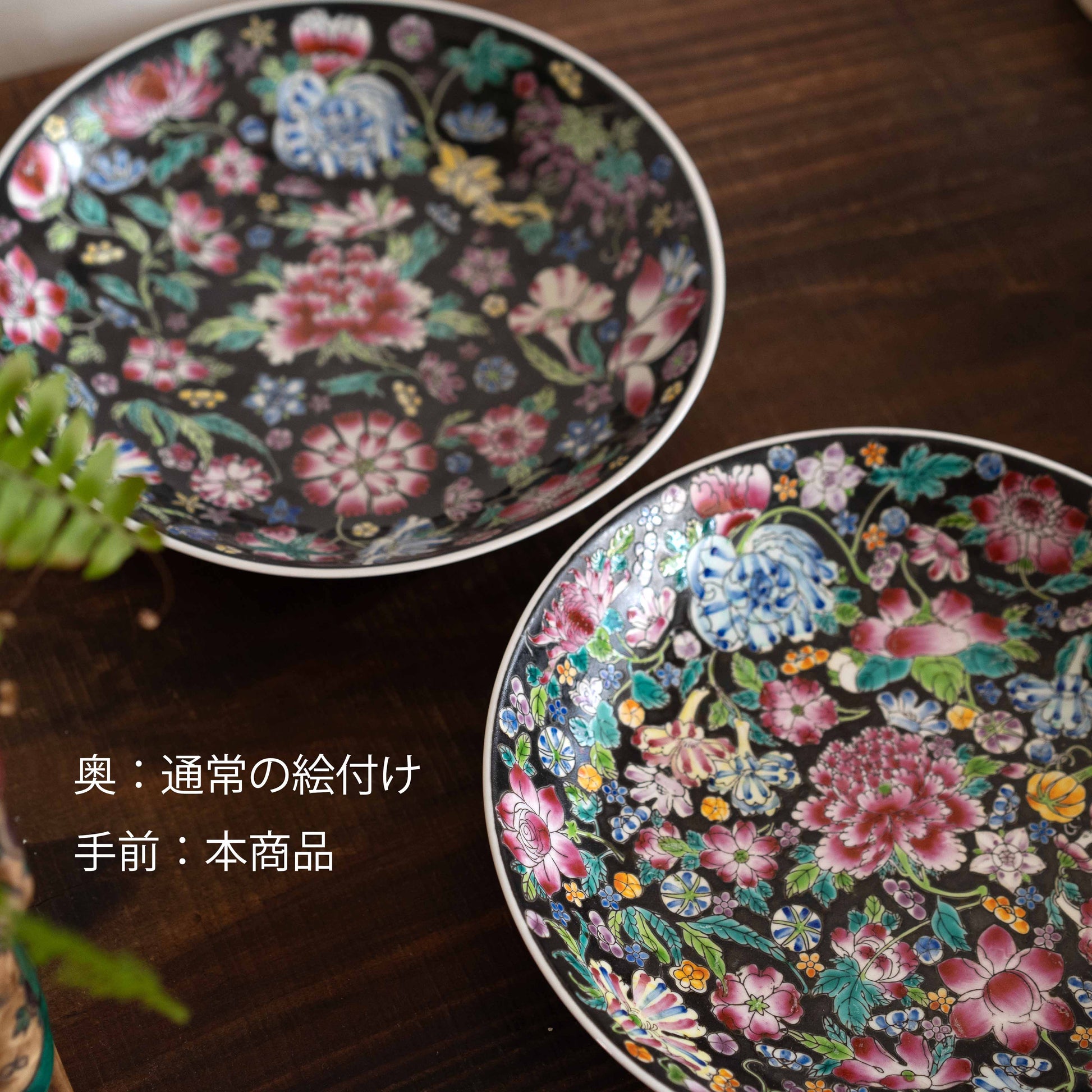 人気のある黒のプレートですが、こちらは花の数が通常より多く、万華鏡のように隙間なく描かれた特別なバージョンです。